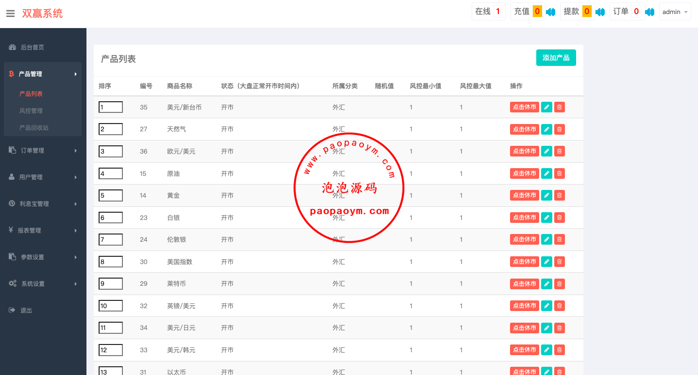 系统前后台是vue开发的,api端是php的,K线对接付费的阿里云前端语言︰中文 英语 法语 俄罗斯 语意大利语 西班牙语 后台:中英双语系统产品: 虚拟币 外汇 黄金 白银 原油 天然气 (可以自行添加)后台有理财...